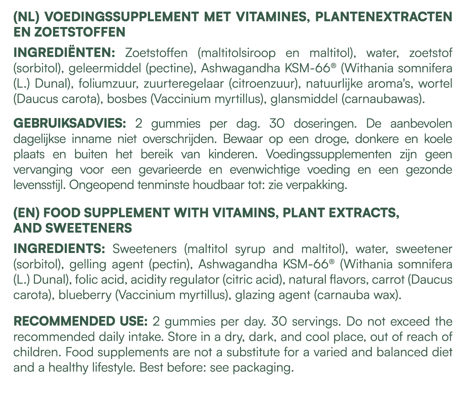 Ingredients: Sweetener (Maltitol syrup, maltitol & sorbitol), water, gelling agent (pectin), acidity regulator (citric acid & trisodium citrate), Ashwagandha KSM-66® (Withania somnifera (L.) Dunal), gamma